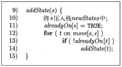 为了实现图中第一行,我们需要将alreadyOn数组中的所有条目都设置为FALSE,然后对于S中的每个状态s,将s压入oldStates并设置alreadyOn[s] 为TRUE。对状态s的操作以及图中第4行中的操作,都可以使用函数addState(s)来实现。