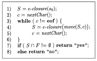为开始状态, 接受状态集为 F,转换函数为move。我们可以通过下面的算法模拟NFA的执行。
