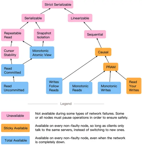 CAP定理说我们不能构建完全可用的线性化系统。有其他证明告诉我们,你不能构建具有顺序、可序列化、可重复读取、快照隔离或游标稳定性的完全可用系统——或者任何比这些更强的模型。在Peter Bailis的高可用事务论文中[2]的这张地图中,红色阴影的模型不可能完全可用。