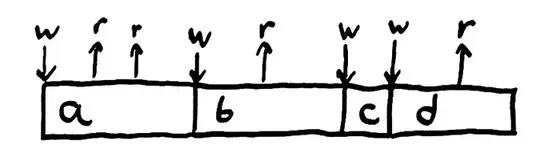 即使有了以上的保证,从独立进程的角度来看,我们的寄存器不变性也被破坏了。Top写入a,读到a,接着读到b——这不再是它写入的值。 我们必须使一致性模型更宽松来有效描述并发。现在,进程可以从其他任意进程读到最近写入的值。寄存器变成了两个进程之间协调的地方:它们共享了状态。