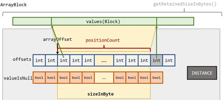 IntArrayBlock 的底层数据其实就是int[] values 和boolean[] valueIsNull这两个数组,这里boolean[] valueIsNull的出现是为了表示某个位置上的值是否为null,毕竟values 是一个基本类型数组,而不是包装类型Integer数组,所以还是需要有个额外的布尔类型数组表示某个位置是否是null。values 数组和 valueIsNull 数组的长度不一定相同,因为IntArrayBlock只会使用其中的一部分数据,即索引为[arrayOffset, arrayOffset+positionCount]的区域。所以这个Block在计算其底层数据大小(sizeInByte)的时候,只会统计自己使用的那一部分。