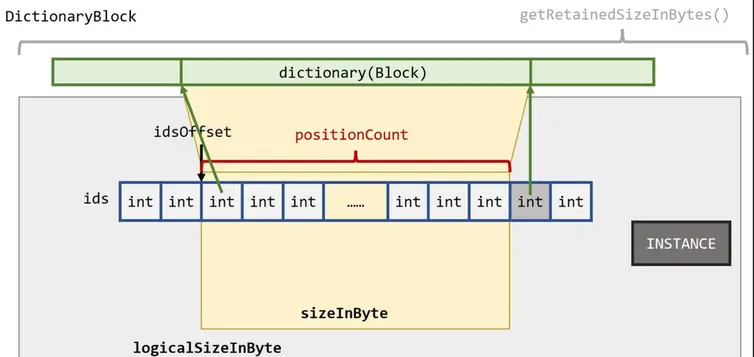 - 若当前的DictionaryBlock是compacted,那么其sizeInBytes和uniqueIds都可以直接获取了,否则,需要调用calculateCompactedSize()方法才能计算。