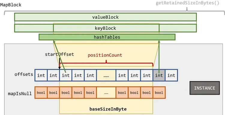 这里就要提到MapBlock 的一个包装类型了—— SingleMapBlock.SingleMapBlock 将 MapBlock 的hashTables利用起来了。由于SingleMapBlock在内部面对的是整个AbstractMapBlock(MapBlock的基类),而不是单独的 keyBlock 和 valueBlock , 所以positionCount是其嵌套的AbstractMapBlock的两倍。