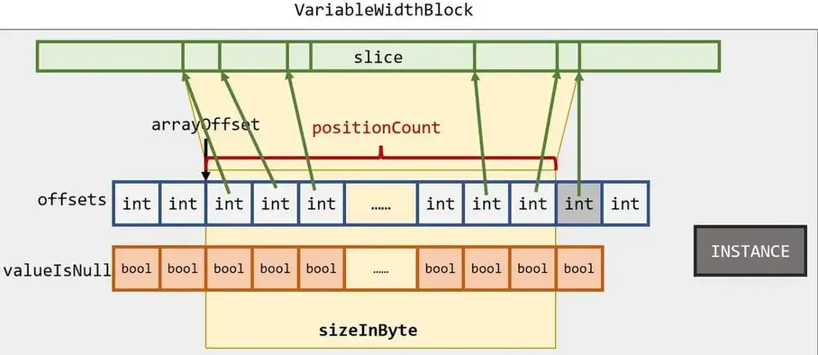 VariableWidthBlock使用的底层数据是Slice类型,Slice类型是一个内存切片,Slice底层是一段连续的内存空间, 有点像python中列表的切片。Trino使用Slice来高效地操作内存。Slice中可以存储各类基本数据,不过主要使用场景是用来存储字符串。VariableWidthBlock 实际上是一段内存切片,然后通过offsets数组,分位postionCount个小的内存切片。与前面一样,offsets数组 和 valueIsNull数组 的长度也是可以不等的,VariableWidthBlock 只会使用其一部分。