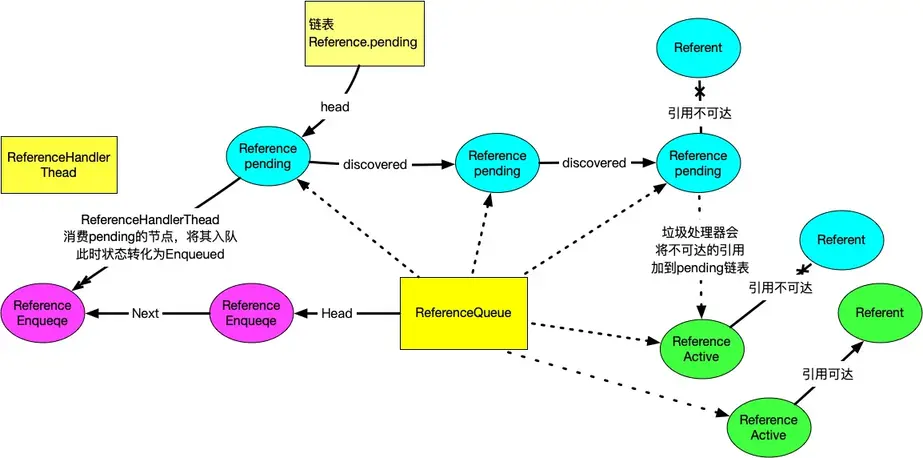 Reference里有个静态字段pending,同时还通过静态代码块启动了Reference-handler thread。当一个Reference的referent被回收时,垃圾回收器会把reference添加到pending这个链表里,然后Reference-handler thread不断的读取pending中的reference,把它加入到对应的ReferenceQueue中。