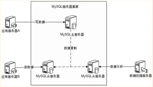 在这种架构中,多台服务器部署Mysql实例,但是它们的角色有主从之分,数据库的写操作都在主服务器上,由主服务器将数据同步到集群中的其它从服务器。数据读操作即数据分销等离线操作在从服务器上进行。