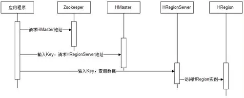 所有HRegion的信息(存储key的值区间,所在HRegionServer地址,端口等信息)都记录在HMaster服务器上,为了保证高可用,HBase启动多个HMaster,并通过Zookeeper选主,应用程序通过Zookeeper获取主Master地址,输入Key值获得Key所在HRegionServer地址,然后请求HRegionServer上的HRegion,获得需要的数据。