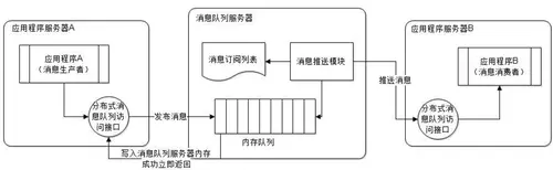 消息生产者应用程序通过远程接口将消息推送给消息队列服务器,消息队列服务器将消息写入本地内存队列后立刻返回成功响应给消息生产者。消息队列服务器根据订阅列表查找订阅该消息的消费者,将消息队列中的消息按照先进先出的顺序通过远程通信接口发送给消费者。