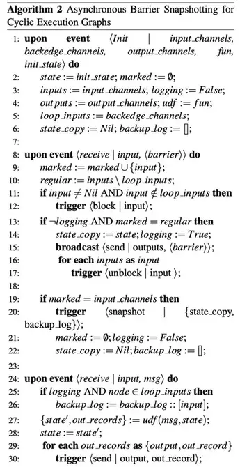 - 从这个时间点开始,这个节点将从back-edges收到的所有record记录下来,直到收到来自相应的barrier(算法26行)。