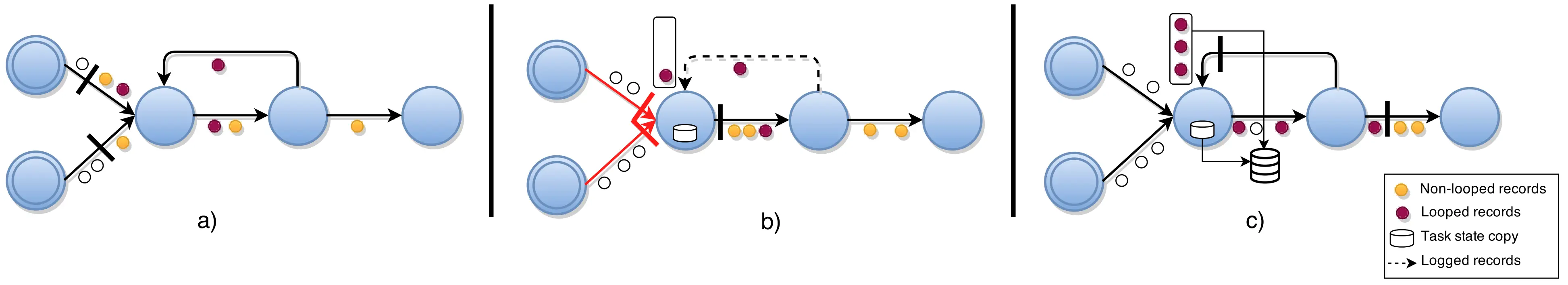 - 快照中包含的每个task的状态,是在处理regular输入接收的post-shot record之前执行的task状态副本。- 快照中包含的下游日志是完整的,由于FIFO保证,包含back-edge接收的所有barrier之前的所有pending的post-shot record。