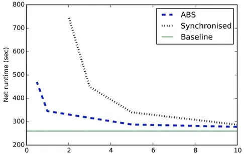 我们测试了不同方案的快照运行时开销,ABS与同步方式快照。在Apache Flink上实现了Naiad中采用的同步快照算法,为了让这个比较有相同的执行后端。这个实验跑在10节点集群上。为了评估算法的可扩展性 我们处理固定数量的数据。同时将并行度从5个增加到40个。