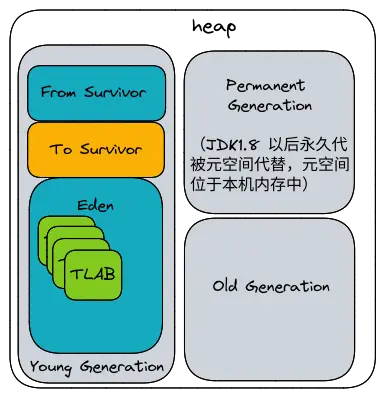 Java堆是垃圾收集器管理的主要区域,也常被称为"GC堆"。如果从分配内存的角度看,所有线程共享的Java堆中可以划分出多个线程私有的分配缓冲区(Thread Local Allocation Buffer,TLAB),以提升对象分配时的效率。不过无论从什么角度,无论如何划分,都不会改变Java堆中存储内容的共性,无论是哪个区域,存储的都只能是对象的实例,将Java堆细分的目的只是为了更好地回收内存,或者更快地分配内存。
