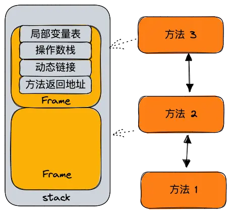 每个方法执行时JVM都会创建一个栈帧,用于存储局部变量表,操作数栈,动态链接等信息。每个方法从调用到执行完成的过程,就对应一个栈帧在虚拟机中入栈到出栈的过程。
