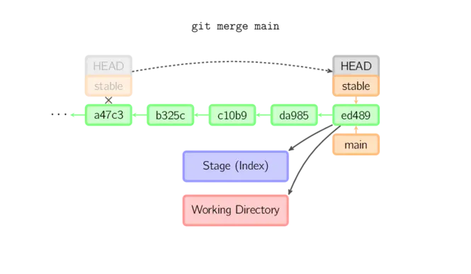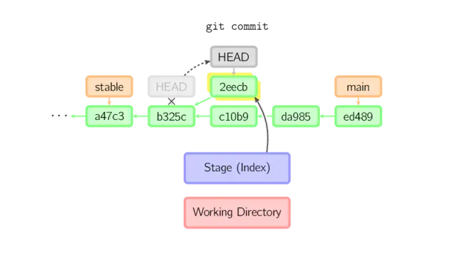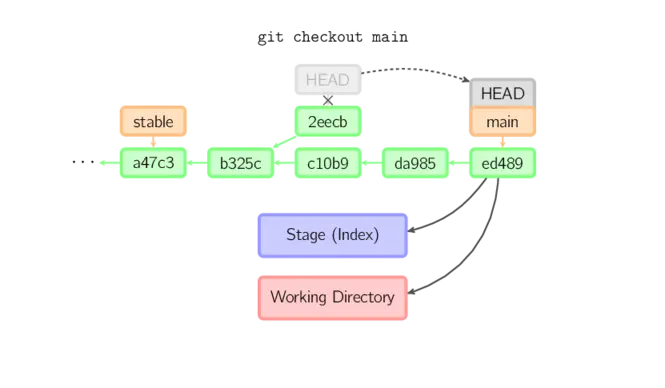 一旦此后你切换到别的分支,比如说main,那么这个提交节点(可能)再也不会被引用到,然后就会被丢弃掉了。注意这个命令之后就不会有东西引用2eecb。