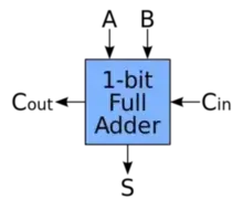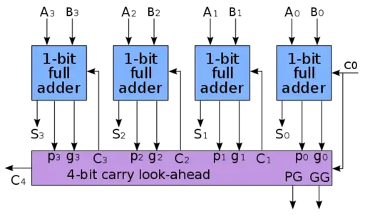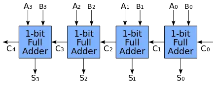 在上图中A0-A3(低位到高位)代表4位二进制数A,B0-B3(低位到高位)代表4位二进制数B。S0-S3(低位到高位)代表A+B的总和,C4代表A+B的进位,如果C4没有得到处理,那么C4也常被称为溢出,为了处理溢出,可以考虑增加位数。