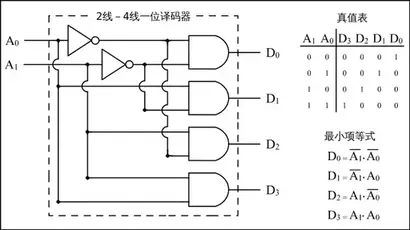 解码器还包括3线-8线解码器或4线-16线解码器等等。我们可以通过小的解码器去组合成大解码器。下图通过两个1线-2线解码器组成2线-4线解码器。