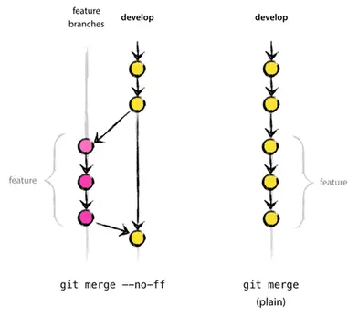 合并中的 —no—ff 标记可以强制为合并操作创建一个新的 commit 对象,将所有原来属于 feature 分支的 commit 记录打包进这个新的 commit 对象中,进而避免 Git 采用 fast-forward 方式进行分支合并,直接将 develop 指向 feature 造成原本属于 feature 分支上 commit 记录丢失(译注:也就是分不出哪些 commit 是原属于 feature 分支上的 commit 了),下面是采用 —no—ff 与 fast-forward 方式进行合并的对比图。