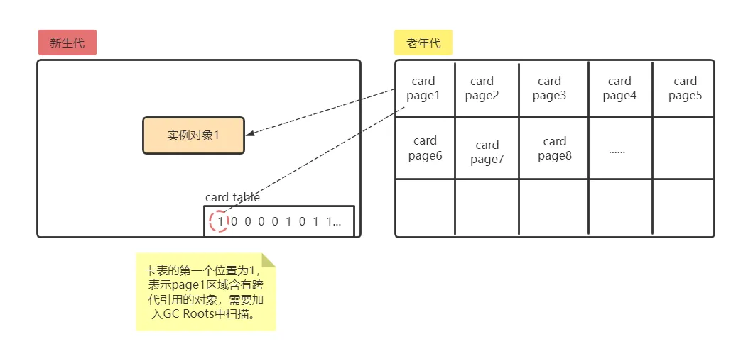 - 内存回收角度: 因为卡表的第一个位置为1,表明该page区域存在跨代应用的对象,垃圾回收的时候需要扫描该区域。