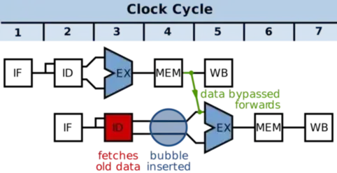 在下面的例子中,第一条指令的MEM级(第4级)之后的可用数据需要作为第二条指令的EX级(第3级)的输入。如果没有气泡,EX级(第3级)只能访问前一个EX级的输出。因此,添加气泡可以解决时间依赖性,而无需在时间上向后传播数据(这是不可能的)。