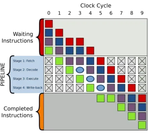 在现实世界中,处理器的管道不仅仅是到目前为止描述的两个(完整的管道或正在填充的管道)。有时,指令会在一个管道阶段中挂起多个周期。