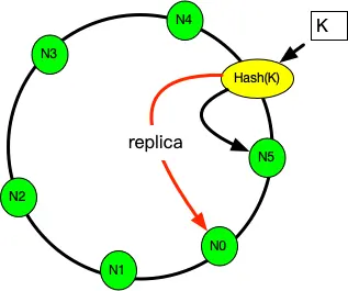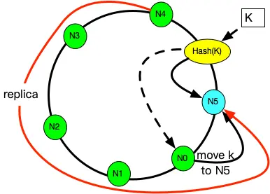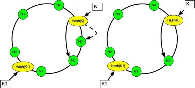 - 移除节点的情况: 每一个节点在执行写请求时,都会写一个备份到顺时针的邻居节点。 这样,当 N5节点因故障需要踢除时,新的请求会交接给它的邻居节点 N0, N0上有 k的备份数据,可以正常读到。